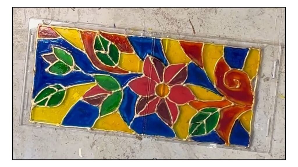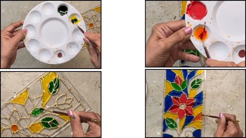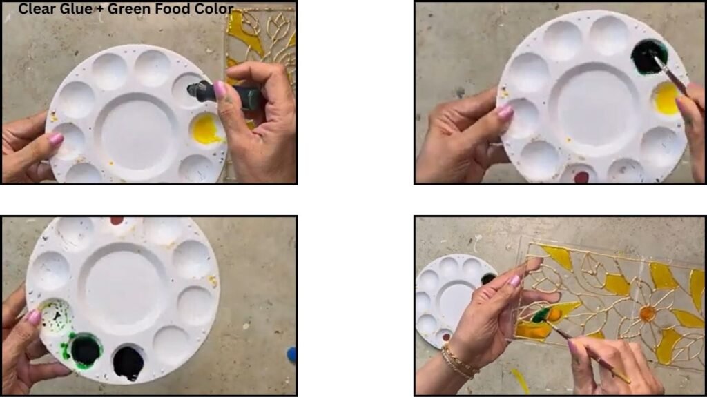 4. After the outline paint dried, I made homemade glass paints using clear glue and food colors as well as acrylic paint. Painted the design on the panel with homemade glass paints. Here as an example I have shown how I made green glass paint by mixing green food color and clear glue.