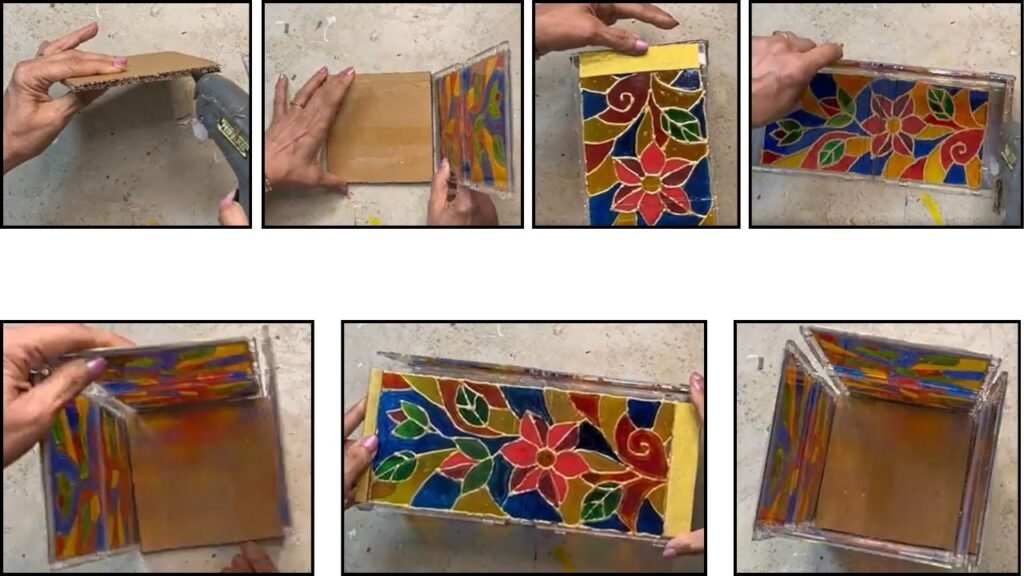 - 8. Sticking Edges of CD covers in a box shape: It was almost impossible for me to stick two CD covers in 90 degrees angle using E 6000 glue. It doesn’t work. You can stick them in 90degrees with help of cardboard, the way I showed in the video.