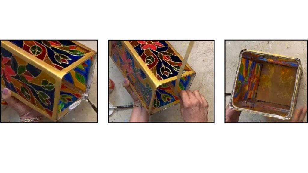 I painted the paper gold, cut it into strips, and glued the strips along the corners of the box to make the structure sturdier.