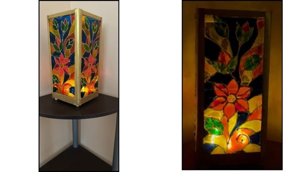 I created this faux stained glass lamp using clear part of CD cases and my own homemade glass paints. The colorful floral design glows beautifully when lit, making it a unique and vibrant piece of home decor.