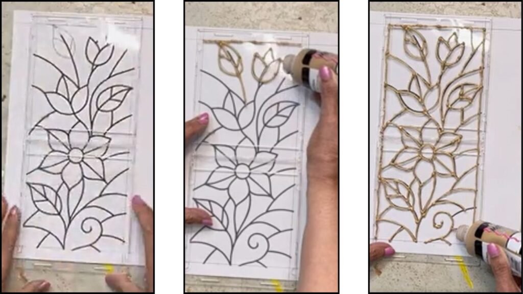 3. I placed each long panel on the printed floral picture and using tulip dimensional gold fabric paint I outlined the picture on each CD cases panel.