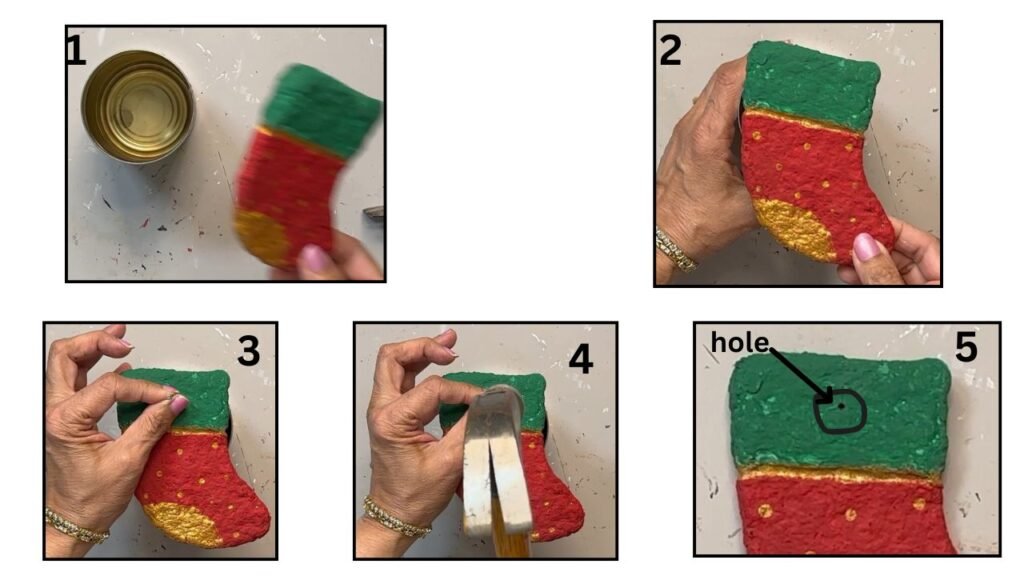 5. After paints dry, make a hole in the ornament. Placed the ornament on an empty can and using a nail and a hammer made a hole. Then put the string through the whole to make a hanger for the ornament. The steops are shown below.