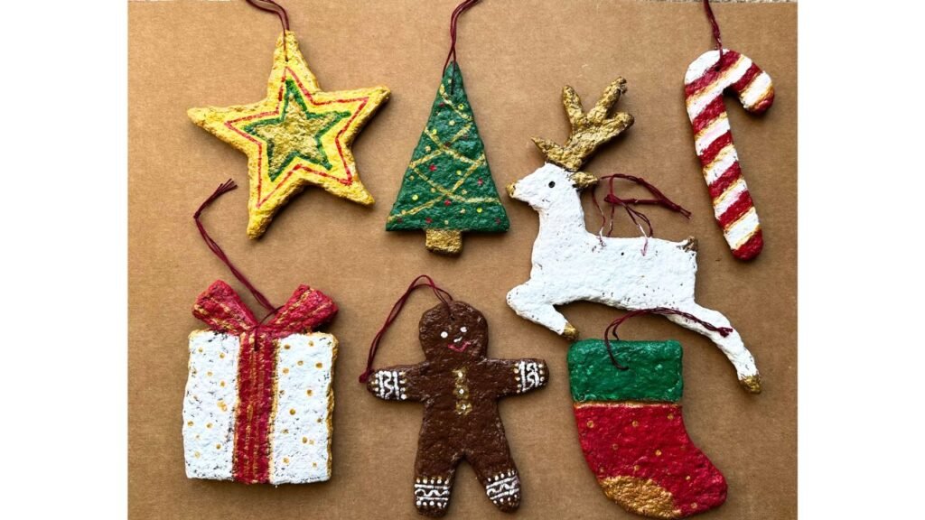 Make beautiful Christmas ornaments as a gift using paper mache clay and cardboard cutouts. It is an easy, inexpensive, eco-friendly DIY craft.