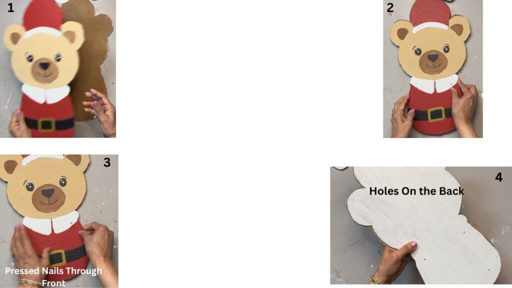 8. Next Make Coordinated holes in th back part Of Teddy. Hold back and front of Teddy together and insert nails through top part and make impressions on the back part of teddy as shown