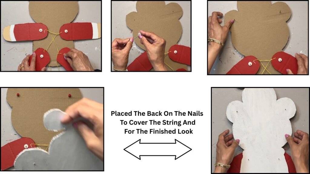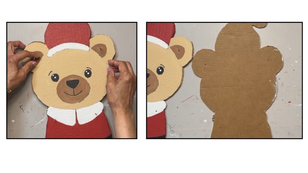 9. Next, Made holes in the Teddy’s ears. First insert nails in the holes of teddy’s body. Then Insert nails in the ears and press them to make impressions on the back part as shown.