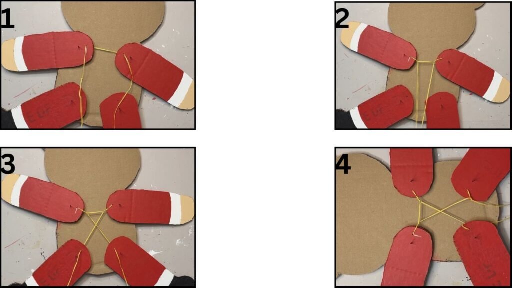 12. Now I strung the string through the arms and legs. You can watch this in action on my video for more clarity. The time period is from 5:25 To 6:37