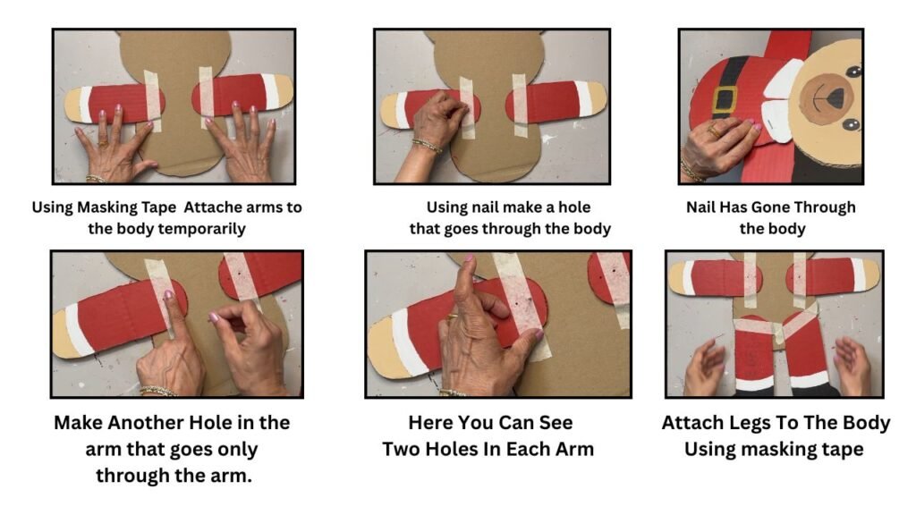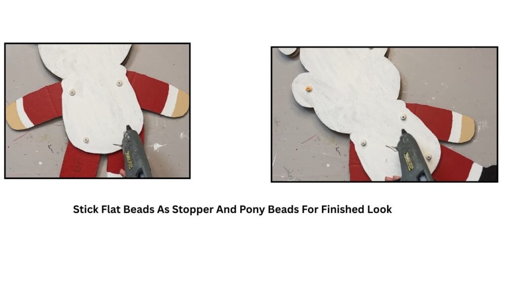 10. Once all the holes are made, inserted flat beads in the nails put the nails through the holes. Then again insert flat beads on the nails. Then strung arms and legs through the nails as shown.