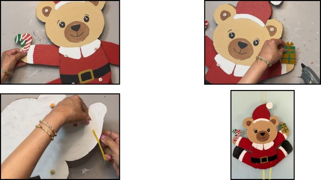 15. Stuck candy cane and gifts on the bear’s arms and finally inserted hanger on the Teddy.