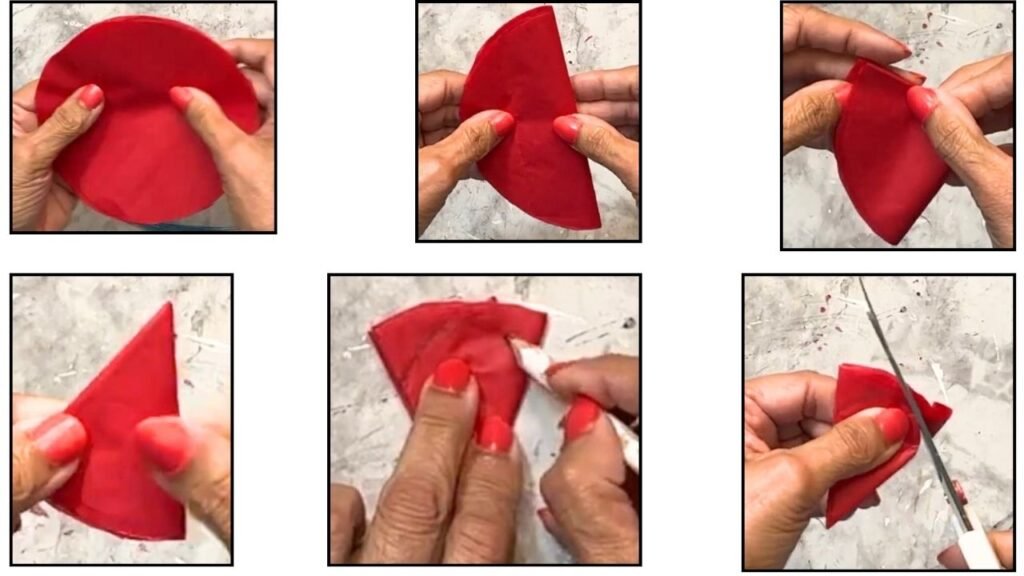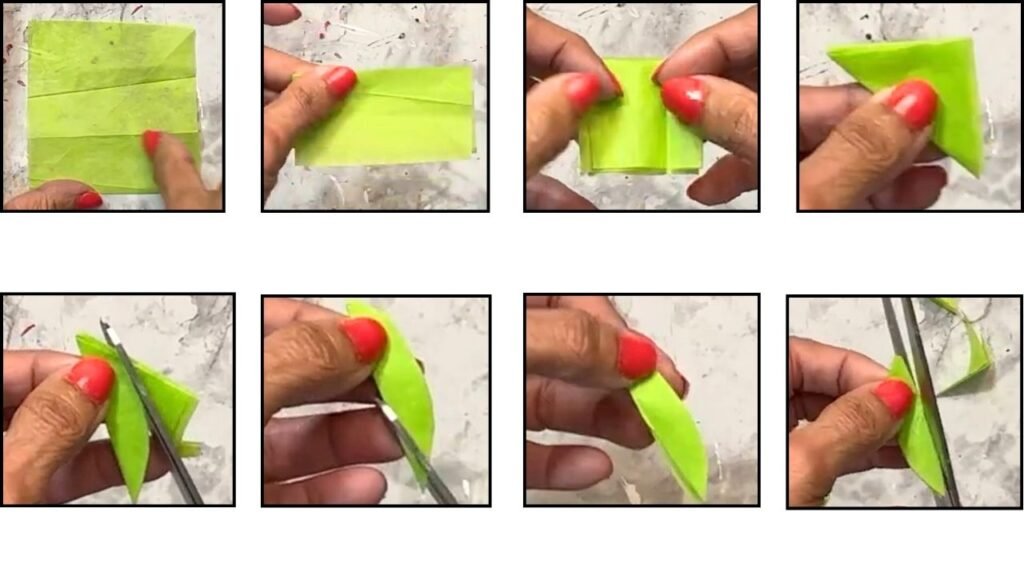 11. Once the rose is formed, I made the cepal of the rose. To make the sepal I took a grren tissue paper square. folded it in half three times until I got a small square. then folded it to form a triangle. then gave it a few cuts. The process is shown below.