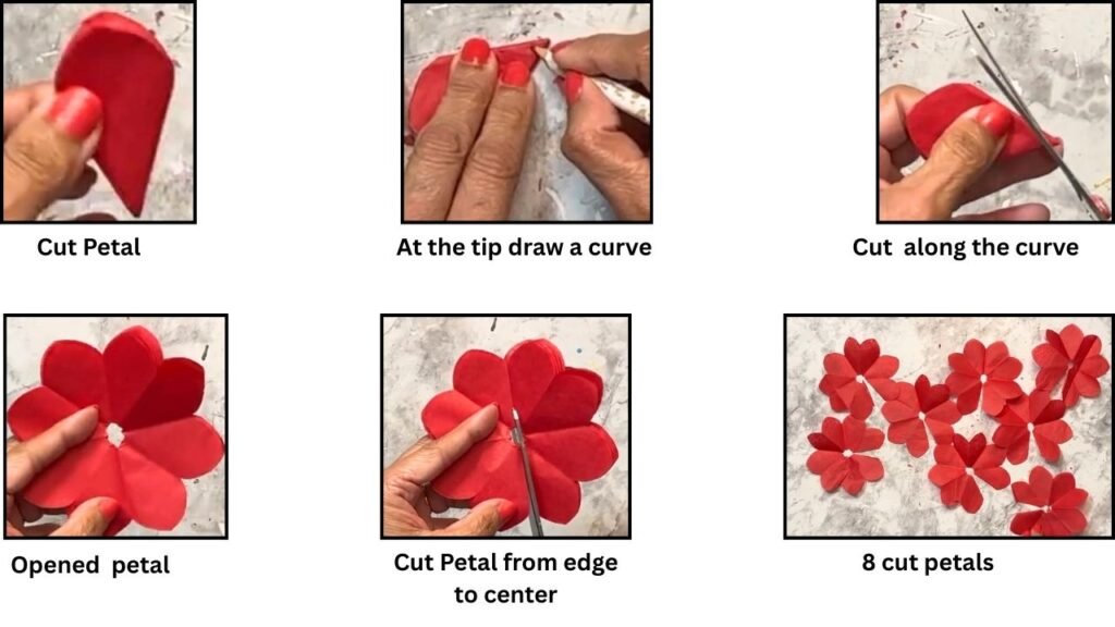6. After the petal is cut, draw a small curve at the tip of the petal and cut it along the curve. Then open the petals. Now you have eight petals. Each petal looks like a flower itself.