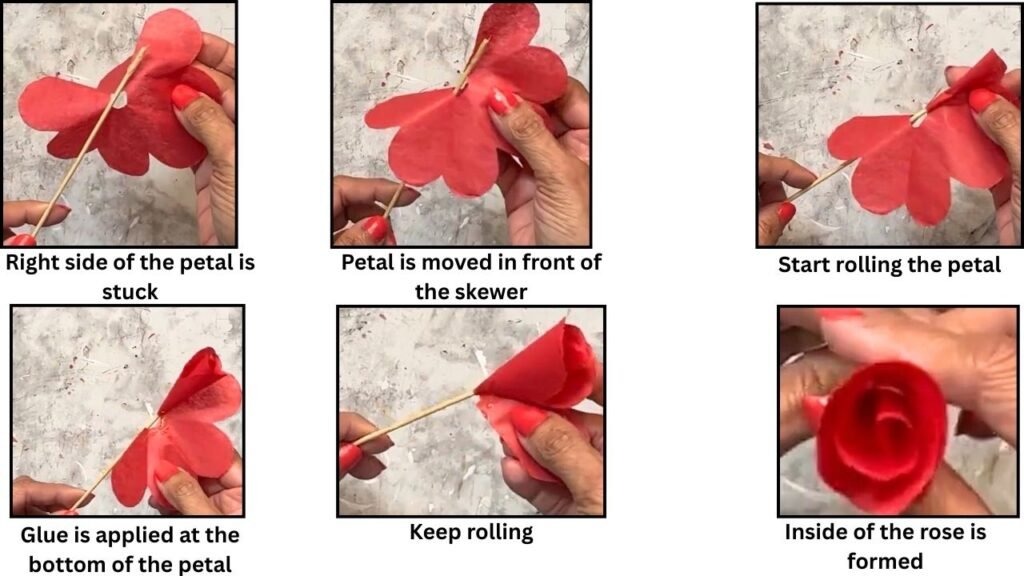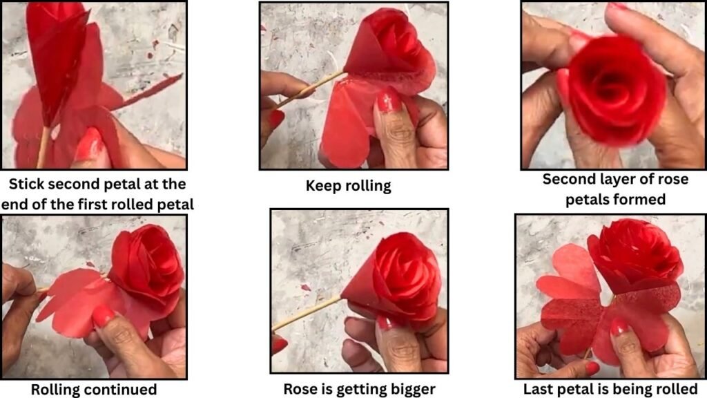 9. Next, attach the second petal where the first petal ended after rolling. Use the same rolling technique to form the second layer of rose petals. Continue following this pattern until all eight petals are rolled and the rose is complete. The process described here is shown below.