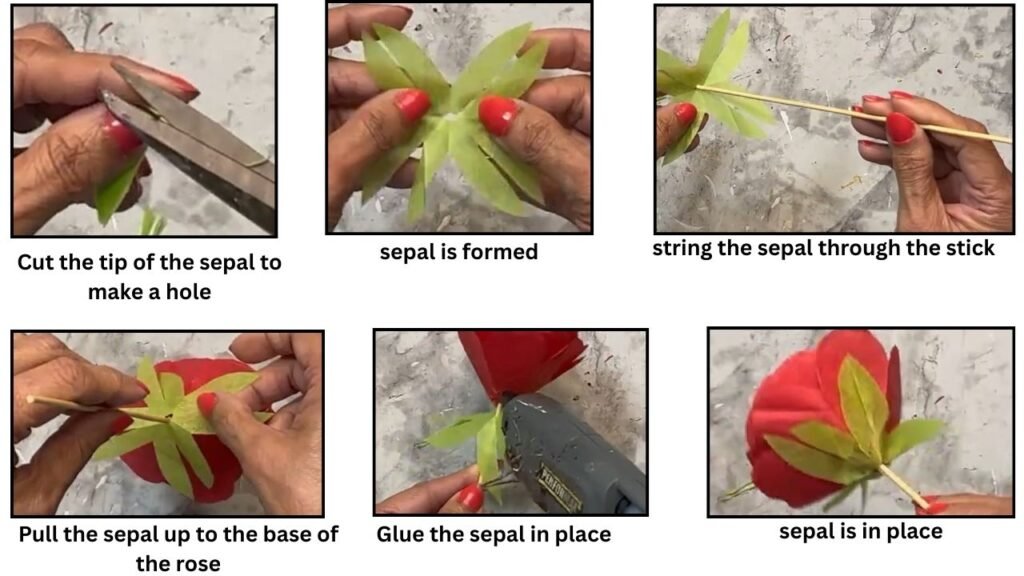 12. Cut the tip of the sepal. then open it. the sepal is now formed. String it through the bamboo skewer. Push it all the way to the base of the rose. and glue it in palce.