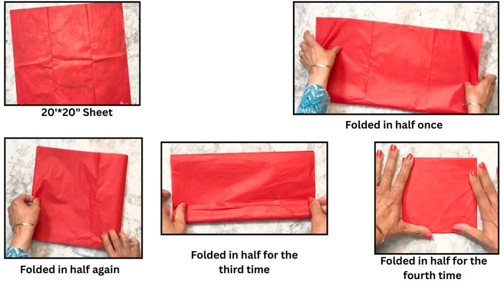 - Take one 20″ by 20″sheet of tissue paper and fold it four times in half until you get a 5″ by 5″ square as shown.