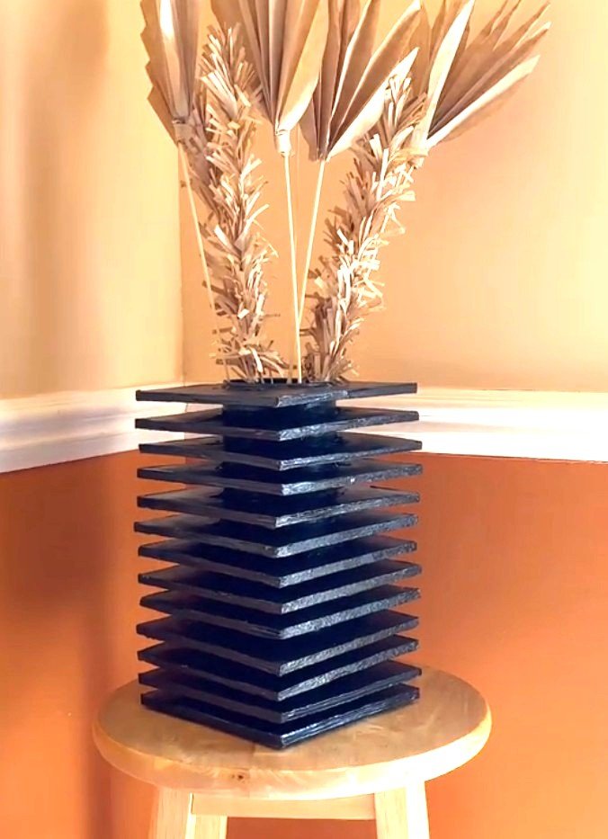 This vase DIY made of mainly recyclable items found around the house. I used cardboard and an empty chocolate canister. Instead of canister you can use a cardboard cylinder. You can bend cardboard into a cylinder. This vase is suitable for a modern home. Stacked cardboard squares create a mesmerizing shadow play effect. It’s a through and through trash to treasure DIY.